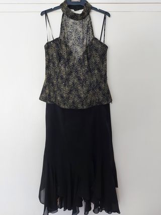 Vestido Mujer 2 piezas para eventos, celebraciones y fiestas. Talla 46. Falda negra con corpiño con transparencia y detalles dorados. También lleva un foulad negro de gasa. En perfecto estado, solamente usado una vez.