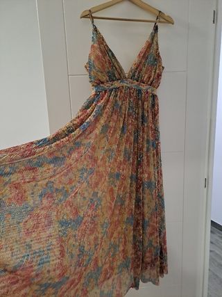 vestido de fiesta, un sólo uso, muy suave al tacto, talla M hombro....31cm sisa...........41cm largo....100,5cm.