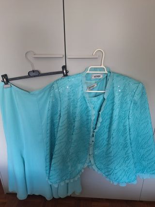 Conjunto de tres piezas para ocasiones especiales. La falta tipo evase de 77 cm de largo. Talla 46 de España - Chaqueta con lentejuelas. - Falda larga a juego. Tal vez necesite una limpeza en seco Ancho hombros chaqueta 41, cintura falda 42,Ancho hombros blusa 40. La blusa tiene cremallera lateral.Ancho por la cintura 50. La chaqueta tiene dis botones interiores .