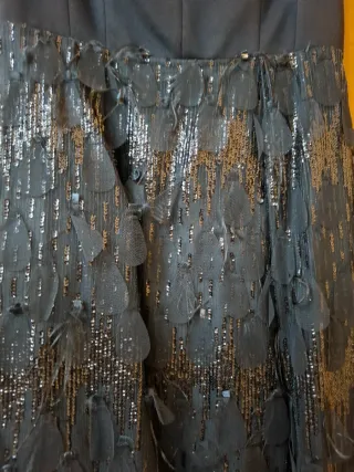 Elegante vestido de fiesta con un diseño único. - Cuerpo superior liso tipo corpiño con tirantes - Falda con lentejuelas y detalle de plumas. - Escote Bardot. - 36cintura y 80 cm largo