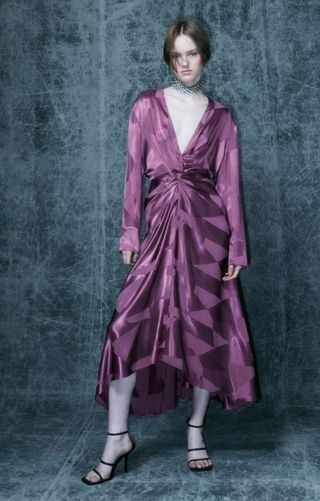 Vestido en tejido satinado, manga larga. Color morado suave, rosado. Cierre con cremallera a la espalda. Talla M. Largo midi. Sienta muy bien, queda muy elegante. Invitada perfecta.