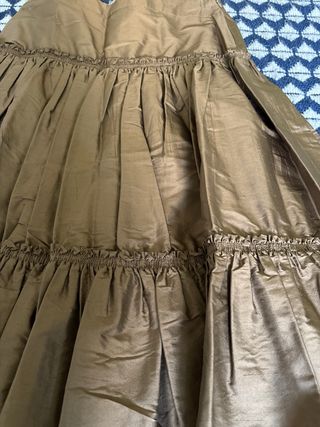 precioso vestido de la coleccion heaven de dolores promesas metalizado. es un color muy original que a veces se ve plateado (el plateado tira a marron)y otras cobre, para chica con tacones alrededor del 1,76, obviamente puede cortarse para menos altura, es una talla 40y talla bien quizas para 38 mejor, precio original casi 500 eur, luego esta muy bien de precio