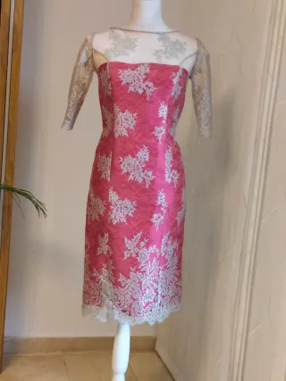 Vestido de fiesta con un diseño sofisticado y detalles de encaje. - Tejido principal en color rosa vibrante. - Mangas y escote con delicado encaje plateado. - Adornos de encaje floral a lo largo del vestido. - Borde inferior con puntilla de encaje.