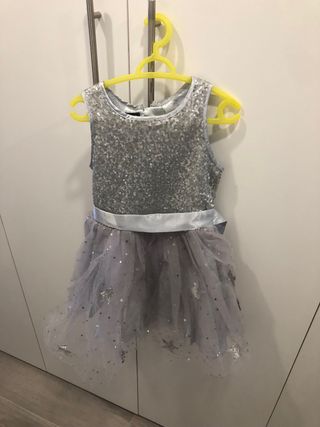 Precioso traje de fiesta con un diseño encantador. - Cuerpo adornado con lentejuelas brillantes. - Falda de tul con estrellas plateadas. - Cinturón de satén.