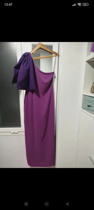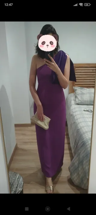 Precioso vestido largo de un solo tirante, ideal para una celebración. Luce un diseño elegante y fluido. • Es de color lila. • Tiene un corte favorecedor • La tela cae con mucha gracia(tengas caderas o no queda bien) -En la parte de arriba queda ajustado y bien -Le he dado poco uso,lavado en tintorería (seminuevo)