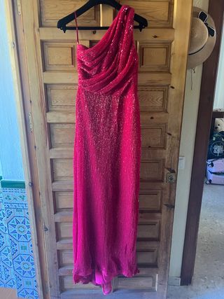Es un traje ideal e irrepetible para asistir a una boda como madrina, hermana de la novia, amiga. Se ha usado solo en una ocasión y llamó la atención de todos. Es de la firma Pronovias. Talla 38. Su tejido es super cómodo y no pesa nada. Tiene el corte en la falda para que se vea la pierna y una pequeña cola que le da distinción.