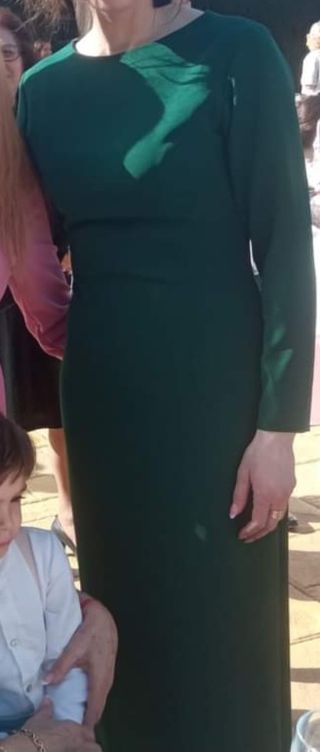 vestido de fiesta verde talla 34/ 36, está hecho a medida xon manga larga, cuello redondo y largo hasta el tobillo, puesto en una sola ocasión, esta en perfecto estado, la tela tiene un poquito de licra, hace una silueta muy bonita..