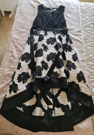 Sin estrenar. Lo compré y al final me quedó grande. Falda ligera a capas por debajo de la rodilla y cremallera lateral, talla 44. Top de encaje, sobre los hombros y atrás tipo corpiño ajustable, pone talla 46, pero es pequeño, por eso combina con la falda talla 44.