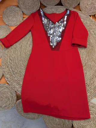 Vestido rojo con detalles de lentejuelas plateadas en el escote. - Diseño con escote en V. - Manga larga o al codo. - Adorno de lentejuelas en forma de V en la parte delantera.