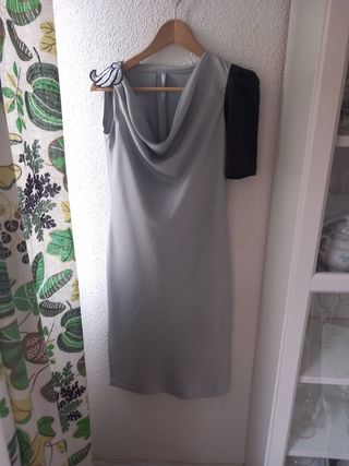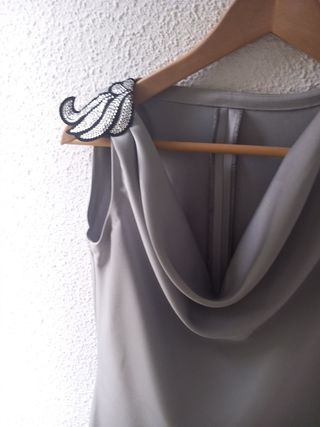 vestido plateado, con capas, elegante e ideal para ocultar la barriguita.
