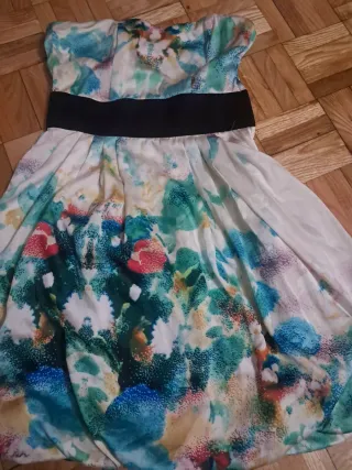 Vestido corto de fiesta con un diseño elegante. - Tejido con textura y detalles en dorado. - Cintura marcada con detalle brillante. - Falda con vuelo. - Ideal para estas fiestas. - Puesto una sola vez. Perfecto estado. -Completamente forrado. -Recogida disponible en Móstoles o Príncipe Pío