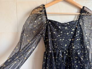 Vestido de fiesta para niña con un diseño de estrellas. - Mangas abullonadas de tul. - Escote cuadrado. - Estampado de estrellas doradas sobre fondo negro.