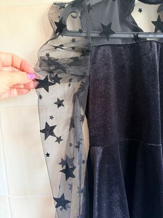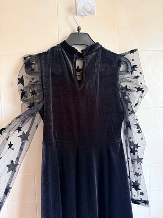 Vestido de fiesta para niña con un diseño elegante y original. - Confeccionado en terciopelo. - Mangas de tul con estampado de estrellas. - Cuello alto. - Abertura en la espalda.