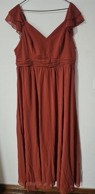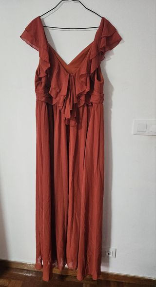 Vestido largo de fiesta en tono naranja quemada de Shein Curve en talla XXL (48/50). Escote y espalda V. Cierre de cremallera. Forro y gasa semitransparente. Medidas: - Hombro 39,5cm - Largo: 161 cm - Pecho: 118 cm - Contorno cintura: 103 cm Nuevo, sin estrenar, compré para una boda pero nunca se llegó a usar, está en perfecto estado. Envío con Inpost en 24h 📦