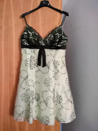 Elegante vestido ideal para ceremonias, usado solo en una ocasión. - Diseño con estampado floral en blanco y negro. - Falda larga con flecos.