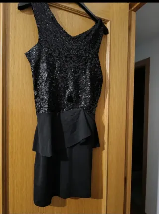 Vestido corto de tirantes para mujer, en color negro y plateado. -Cuerpo fruncido, plateado simulando purpurina. -Tejido ligero. -Nuevo, sin estrenar. -Para ocasiones especiales. Nochebuena, Nochevieja, Navidad, fiesta... Envíos en la mayor brevedad posible.