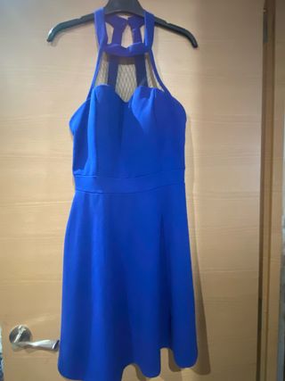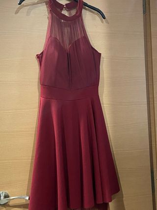 Elegante vestido para eventos especiales. Su diseño moderno y favorecedor lo hace ideal para cualquier celebración. - Escote halter con detalles de malla. - Corte ceñido en la cintura. - Falda con vuelo. - Trae copas para el pecho.