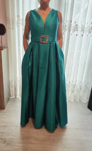 Elegante vestido de fiesta, ideal para eventos especiales. Solo se ha usado en una ocasión. - Diseño sin mangas. - Escote pronunciado en V. - Cinturón con detalle de pedrería. - Falda amplia con bolsillos.