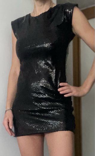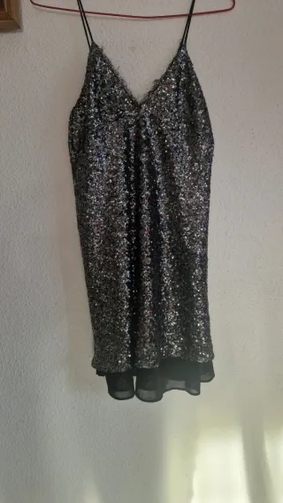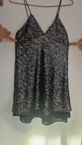Vestido corto con lentejuelas plateadas y negras. Ideal para eventos especiales. - Diseño con tirantes finos. - Escote flequitos desilachados. - Acabado brillante. - Doble capa de tela negra.