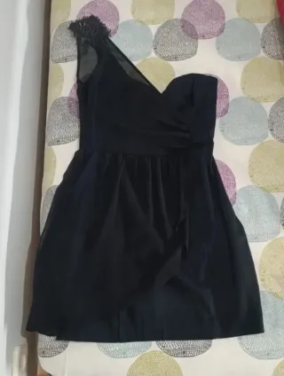 Vestido corto de mujer, de tirantes, en color negro. -Cremallera en la espalda, haciendo escote trasero en V. -Cuerpo fruncido y falda holgada. -Tejido ligero, usado sólo una vez. -Para ocasiones especiales. Nochebuena, Nochevieja, Navidad, fiesta... Envíos en la mayor brevedad posible.