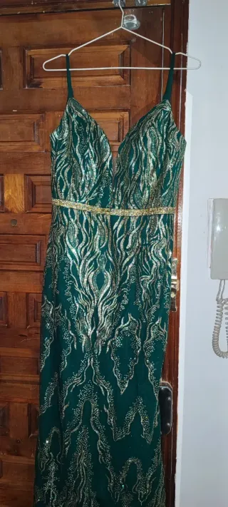 Elegante vestido de fiesta de la marca Paparazzi. - Diseño largo y ajustado. - Detalles brillantes en dorado sobre fondo verde. - Vestido con escote con tul dorado . - talla XL - Tirantes ajustado a mi talla 160cm de ahí su precio 50 euros ya que su precio original fue 200 euros en la tienda Paparazzi . - Solo usado 1 vez no ha pasado tintorería . Se entrega en parla .