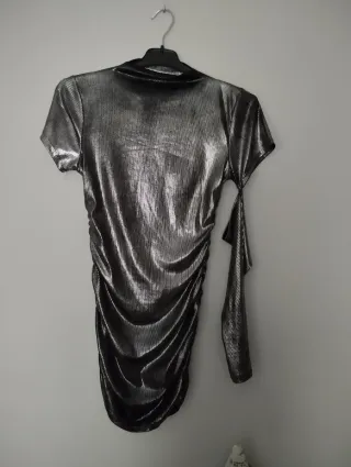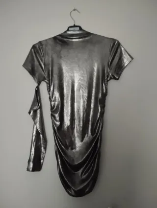 Vestido de fiesta con un llamativo acabado plateado. Su diseño presenta un drapeado elegante que realza la figura. La talla es una 13/14 pero equivale a una talla xxxs. Es elástico. Las medidas hombro a hombro: 34'5 cms. Medida cuello: 16'5 cms. Medida ancho: 36'5 cms. Medida de largo: 77'5 CMS. Medida de sisa: 19 cms. Entrega en Parla o Madrid. Pago en efectivo. - Manga corta. - Cuello alto. - Detalle de drapeado lateral.