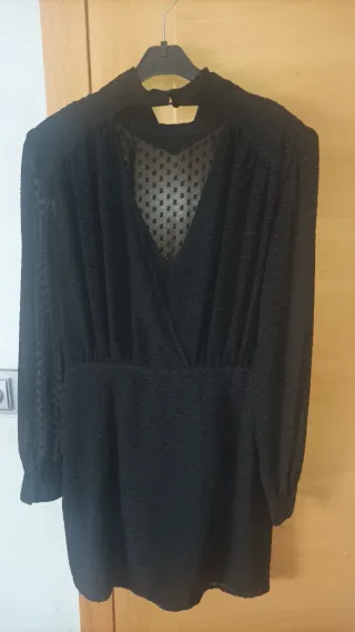Elegante vestido negro de fiesta con un diseño sofisticado. - Tejido con textura de topitos. - Escote pronunciado con detalle de transparencia. - Cintura elástica para un mejor ajuste. - Abertura en la espalda.