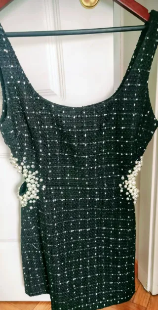 Elegante vestido de fiesta de Zara con un diseño único. - Tejido texturizado en blanco y negro. - Detalle de perlas en los laterales. - Corte moderno y favorecedor.