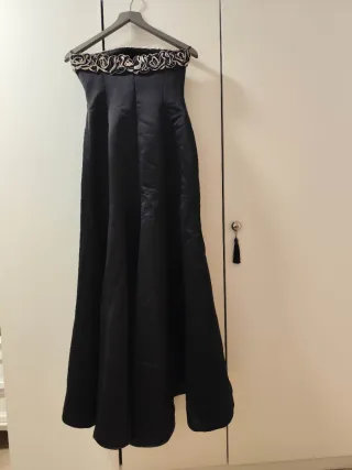 Elegante vestido de fiesta largo en raso negro. Ideal para eventos especiales. - Diseño sin tirantes. - Adorno floral en el escote. Cintura 34, cadera 50, largo 135.