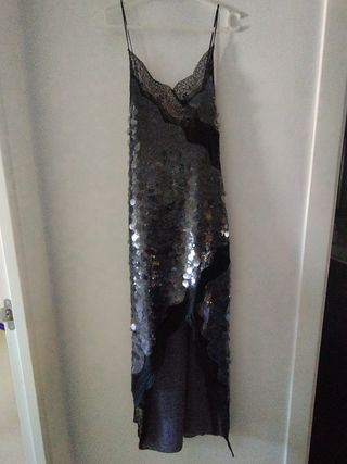 Vestido de fiesta con lentejuelas. Plateado. Talla S. Estira un poco. Espada descubierta. Medidas aproximadas: Contorno de pecho: 84cm Contorno cintura: 68cm Contorno bajo: 84cm Largo: 81cm #fiesta #moda #vestido #oferta #mujer #hagoenvios #ropasegundamano #spain #españa