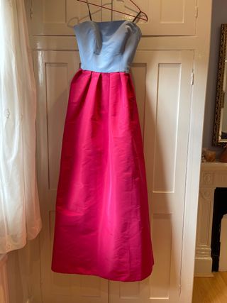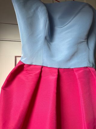- Vestido de fiesta de Monique Lhuillier. - Primavera-Verano 2021. - Color azul cielo y rosa fucsia. - Talla US 8. - Nuevo con etiquetas. - Precio de venta: £3910. - Con bolsillos. - Se ha descosido un pequeño trozo en la zona de la cremallera (nada importante). - Tiene una pequeña mancha en el bajo de la falda en la zona trasera (adjunto imagen). - De seda. - Falda a todo volumen. - Cuerpo tipo corset.
