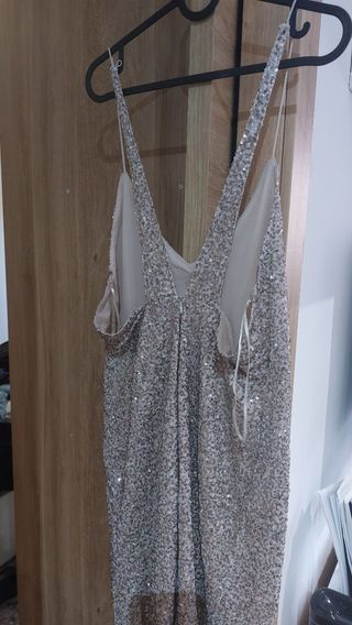Precioso vestido de fiesta, talla M/L. Ideal para una ocasión especial. - Diseño elegante y favorecedor. - Confeccionado con tejido brillante. - Espalda descubierta con cordones ajustable que realza la figura.