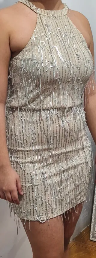 Vestido ideal para eventos y fiestas, con un diseño elegante y llamativo. - Tejido de malla con detalles de lentejuelas plateadas. - Diseño de cuello halter. - Acabado con flecos de lentejuelas.