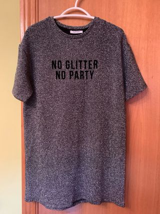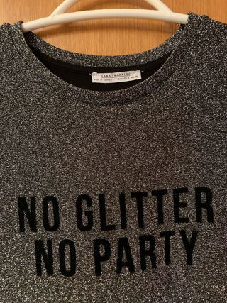 Vestido de Zara Trafaluc con un diseño llamativo. - Tejido con acabado brillante. - Mensaje No Glitter No Party en la parte delantera. - Ideal fin de año u otras fiesta -Talla S pero es ancho -Pueso 1 vez solo