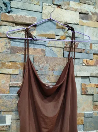 Vestido de fiesta elegante en color marrón. Ideal para eventos especiales. - Tirantes finos ajustables. - Diseño con caída. - Tejido ligero y fluido.