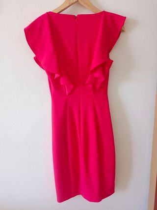Vestido corto de fiesta en color rojo carmín, aunque en las fotos parece rosa. Presenta un diseño con drapeados muy finos que le dan un toque elegante y moderno. Utilizado una sola vez - Diseño asimétrico. - Tejido con textura arrugada. - Tirante fino.