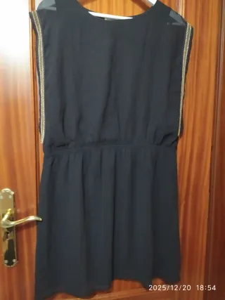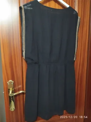 Elegante vestido de fiesta negro, perfecto para ocasiones especiales. Su diseño combina un tejido ligero con detalles que aportan un toque de brillo. - Diseño con detalles de cadena dorada en los hombros. - Cintura elástica para un ajuste cómodo. - Tejido vaporoso y fluido.