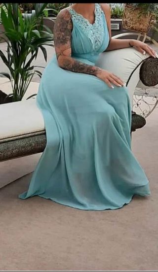 Elegante vestido de fiesta en color azul, talla S. Ideal para eventos especiales. - Diseño con detalles de encaje en el escote. - Falda larga y fluida.