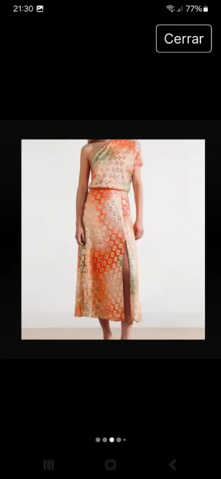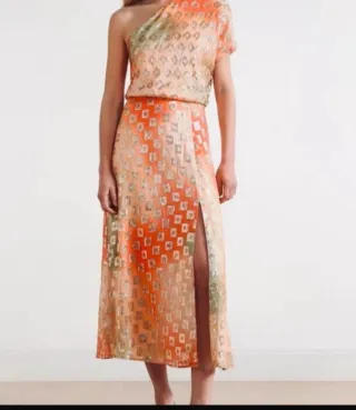 Vestido de fiesta de la marca Scalpers. - Diseño de un solo hombro. - Estampado geométrico en tonos naranjas y verdes. - Falda larga con abertura lateral. Sin estrenar costaba 120