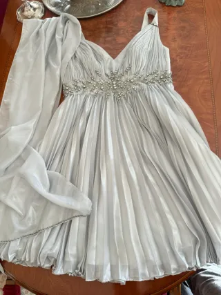 Elegante vestido de fiesta con un diseño plisado y detalles de pedrería en la cintura. - Color plateado brillante. - Escote en V. - Adorno de pedrería en la zona del abdomen. - Diseño plisado en toda la falda. - Incluye un chal a juego.