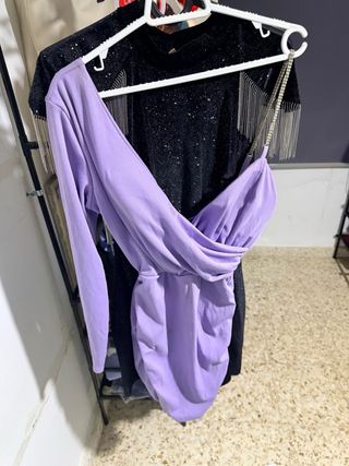 Vestido de fiesta con un diseño moderno y elegante. - Color lila vibrante. - Corte asimétrico. - Manga larga en un lado. - Detalle drapeado en la cintura. Vestidos a 10 cada vestido y bodi 7€ cada uno