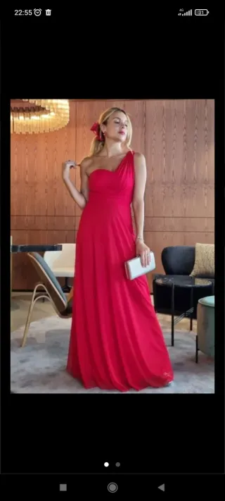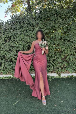 Vestido de fiesta elegante, ideal para damas de honor o eventos especiales. - Diseño de un solo hombro. - Detalle de drapeado. - Abertura lateral. - Tejido satinado. Solo un uso Valorado en 260€