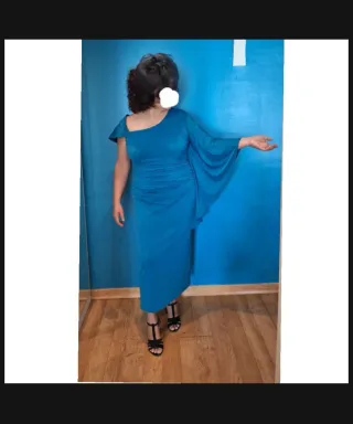 Elegante vestido de fiesta, ideal para bodas y eventos especiales. Su diseño asimétrico y drapeado lo hacen único. Las fotos son de la prueba en casa, pero no llegué a estrenarlo porque no asistí al evento. La tela es un poco elástica, lo que hace que sea comodísimo de llevar. Aunque es talla M, da para L y para más, quedando bien en cualquier cuerpo. Te regalo el tocado de rejilla /red para el pelo si compras el vestido. (Ver foto número 3) - Corte asimétrico. - Detalle drapeado. - Largo midi.