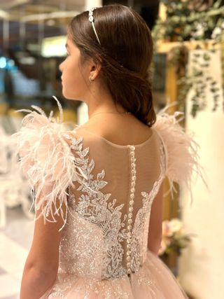 Precioso vestido para niña, ideal para eventos especiales comp reina o dama infantil . ✨ - Diseño de princesa, con falda amplia y vuelo. - Apliques brillantes y plumas en los hombros. - Cierre de botones en la espalda. - Perfecto estado.
