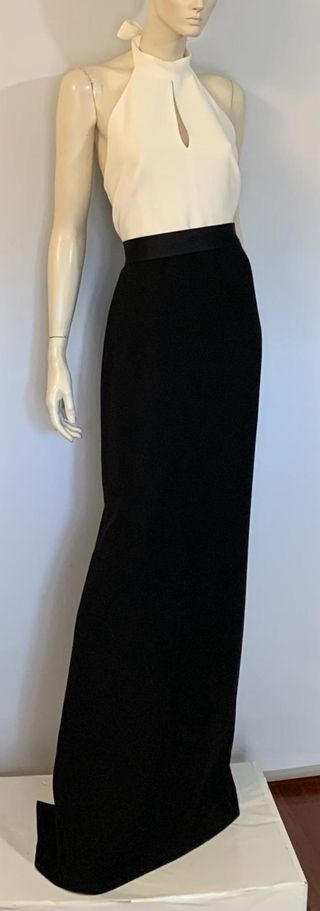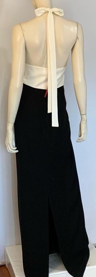 Vestido maxi fiesta bicolor en blanco y negro Cuello halter con lazada y cinta regulable interior en dos posiciones, cinta para lazada en el cuello. Falda negra maxi totalmente forrada con abertura en la parte de atrás. Talla 6 EEUU que equivale a una S internacional. Medidas: circunferencia de pecho 92-94 cm, circunferencia de cintura 76-78 cm, largo 160 cm aproximadamente.
