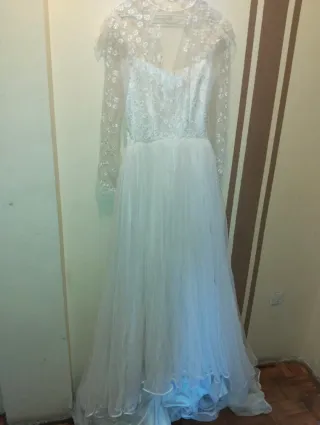 Se vende precioso vestido de novia del año 1984, con encaje, y volantes por detras con un poquito de cola. Tiene cinturon de raso, cremallera para abrochar y el velo blanco. Está hecho a mano por una modista profesional para una altura aproximada de 1,50 cm. y una talla mas o menos entre 40 y 42. Es ideal para una boda con estilo vintahe o retro. Se escucha cualquier tipo de oferta, siempre y cuando sea lógica, jeje. Por favor, solo cotactadme a traves de este chat.
