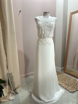 Mod. Mosaico. Vestido de novia original de Aire Barcelona del grupo Rosa Clará, diseño muy elegante y delicado. Vestido con falda fluida de gasa/chiffon que cae con mucha elegancia y movimiento. El cuerpo está decorado con pequeños bordados y pedrería, que aportan brillo sutil y un estilo muy romántico. La espalda en V estiliza mucho y lo hace muy elegante para ceremonia o boda civil. Características • Marca: Aire Barcelona - Grupo Rosa Clará • Talla: 44 • Falda fluida de gasa • Detalles bordados con pedrería • Espalda en V elegante • Muy ligero y cómodo Precio original: 795€ Precio: 150€