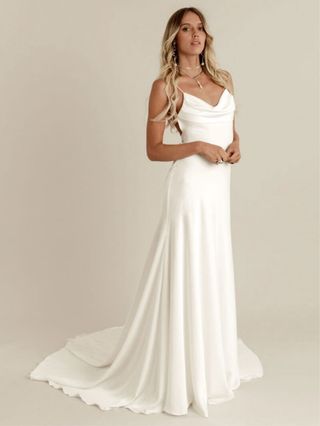 Elegante vestido de novia de corte sirena. Diseñado con tirantes finos y escote en V. - Silueta que realza la figura. - Tejido liso y fluido. - Cola sutil.