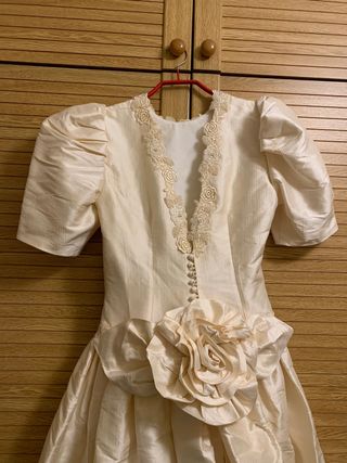 Vestido de novia vintage de la marca Raimon Bundó, confeccionado en seda salvaje. Color champan. Estado impecable. - Diseño con escote espalda en V adornado con encaje floral y pedrería - Mangas abullonadas cortas. - Cierre de botones forrados en la espalda. - Detalle de gran flor de tela en la cintura. - Falda con volumen. - Incluye cancan y velo. - Lavado en tintorería.