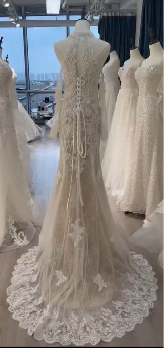 Elegante vestido de novia estilo sirena, con un diseño intrincado de encaje sobre una base de color beige y blanco, que frega el suelo con una correa en la espalda, puede ajustarse según la forma del cuerpo. Para referencia: Mi cuerpo mide 39 cm en los hombros, 96 cm en las caderas, 72 cm en la cintura y 87 cm en el pecho. Incluye un velo a juego. Precio original: 2000£ - Diseño de encaje detallado. - Corte sirena favorecedor. - Incluye velo.